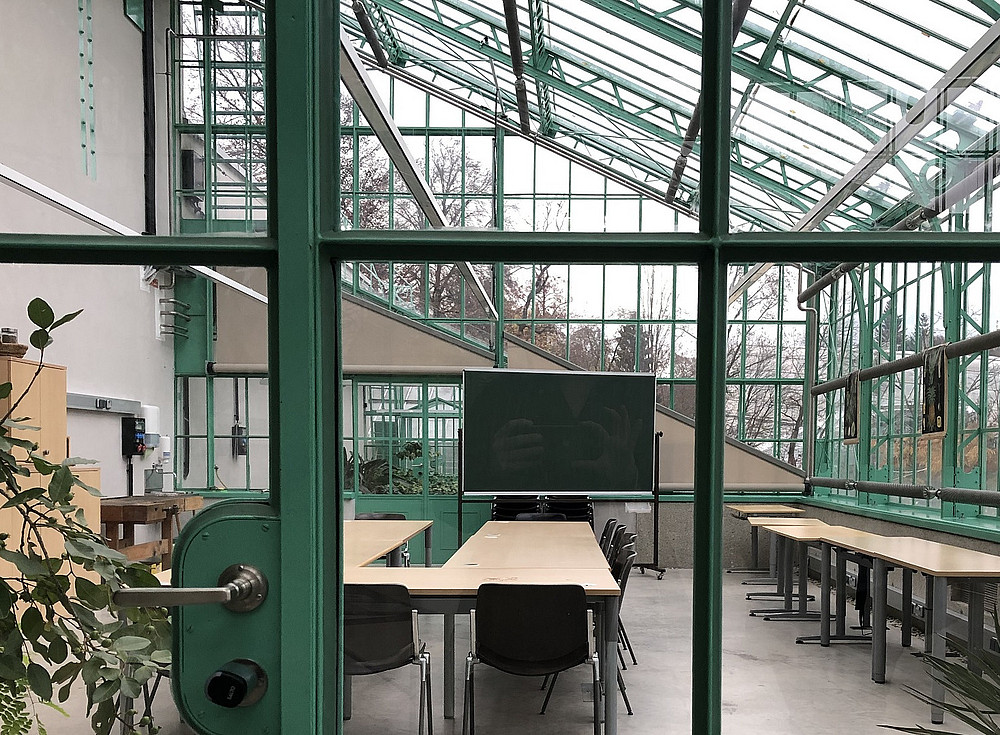Location: Workshopraum (0057EG0005) im historischen Gewächshaus im botanischen Garten (Schubertstr. 59)
